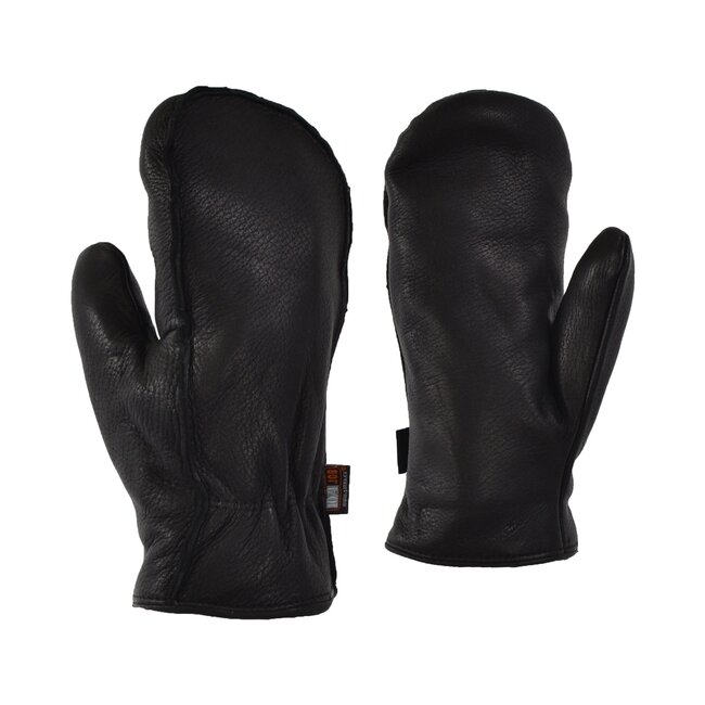 Deerskin leather mitt with polar fleece lining, a Thinsulate inner membrane and an elastic at the wrist.